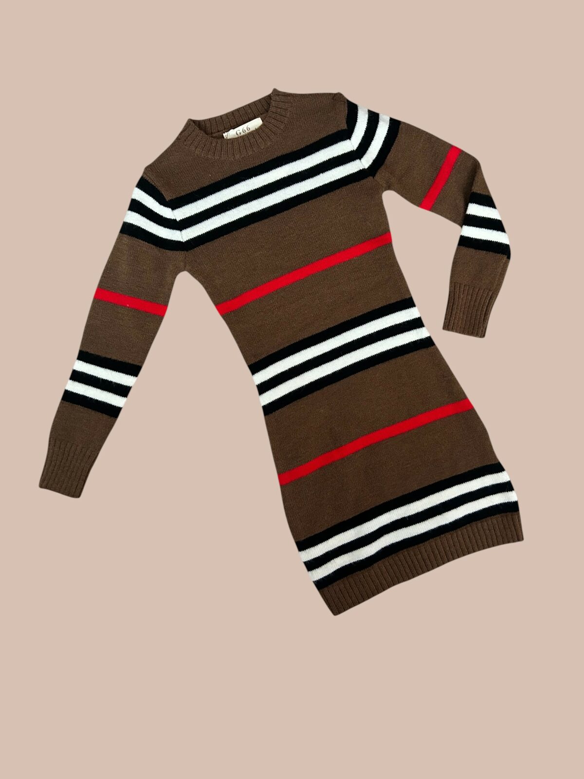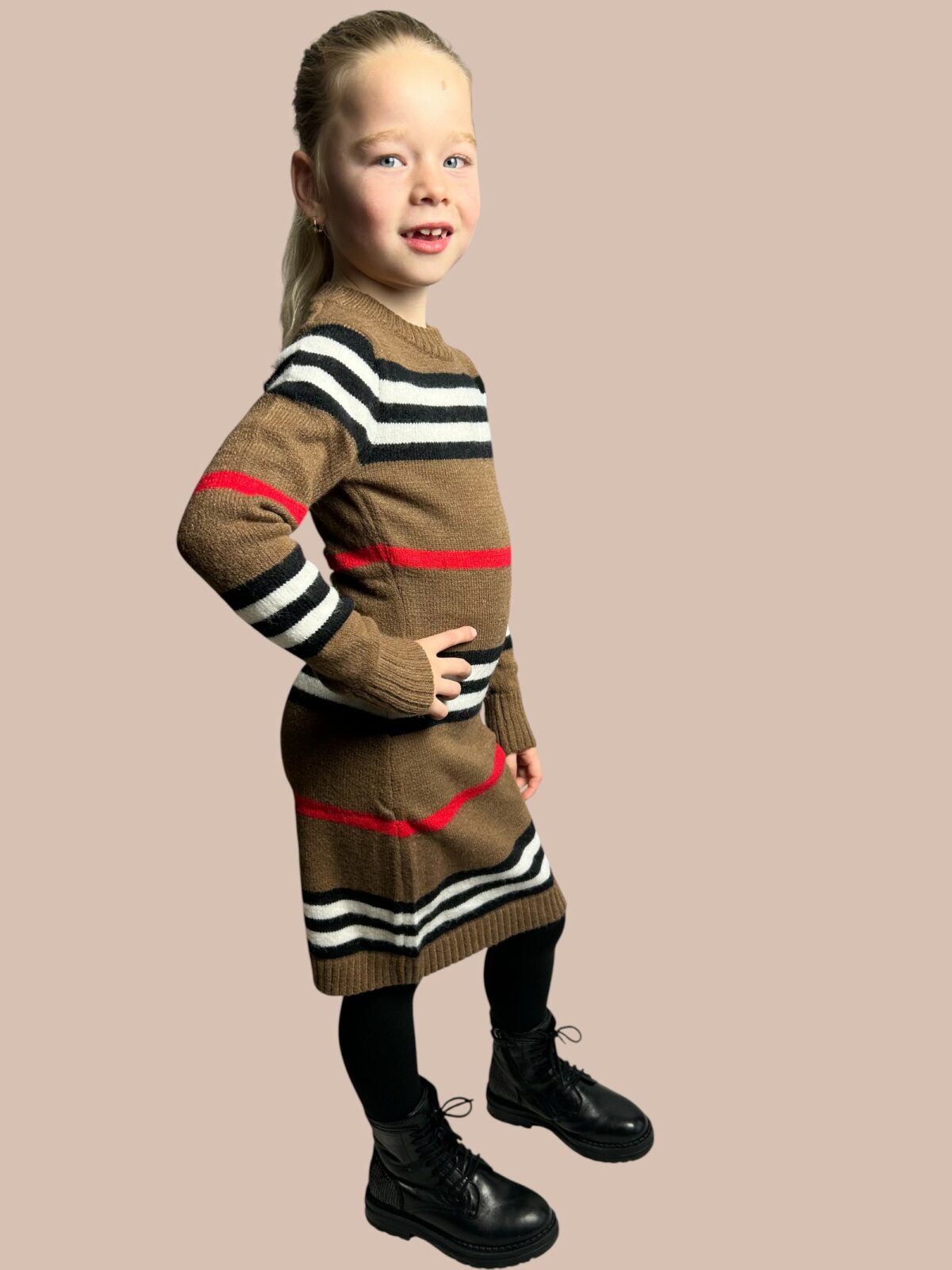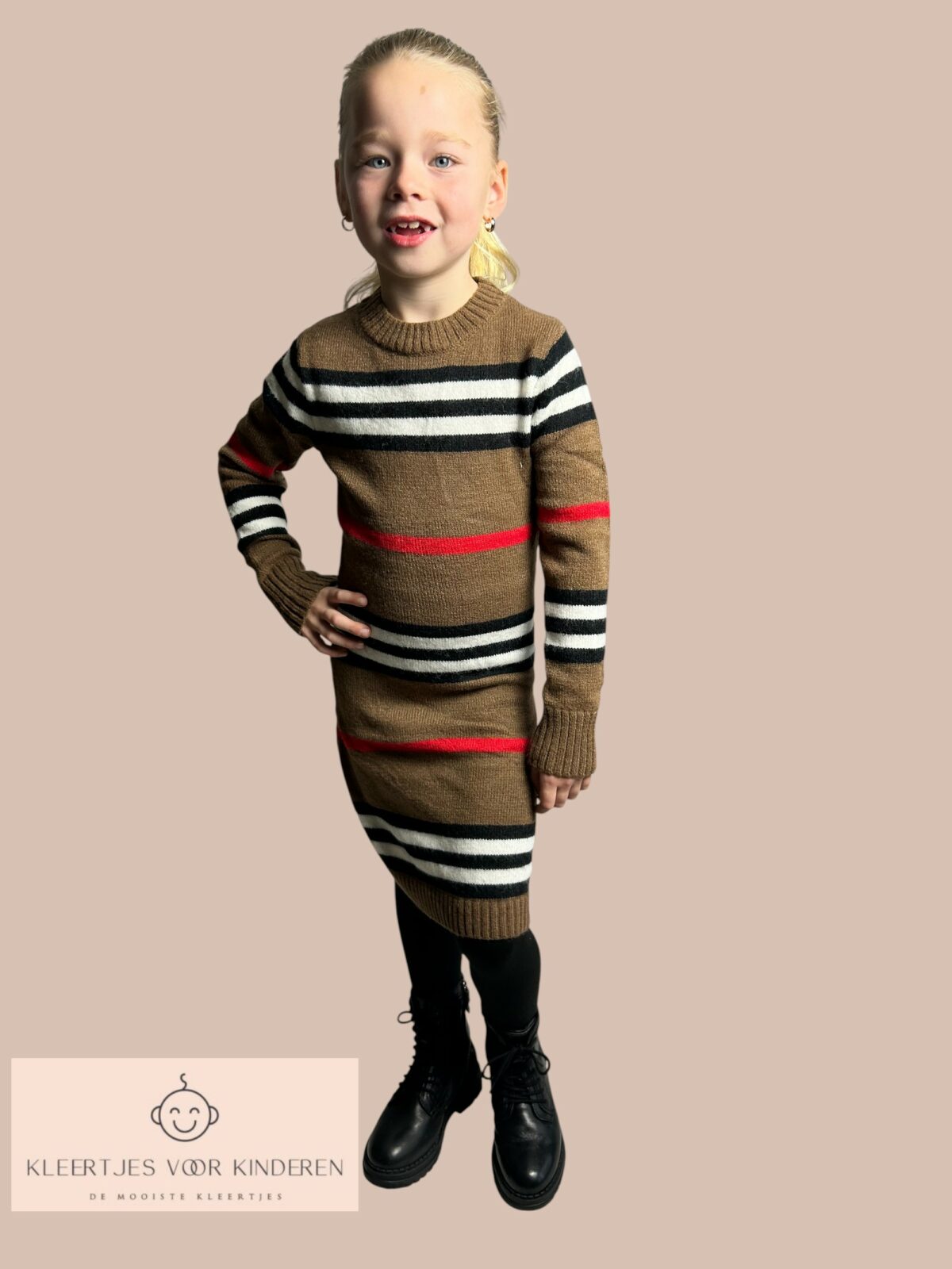 De bruine basiskleur met zwarte, witte en rode strepen geeft een stoere én trendy look. De zachte stof voelt heerlijk aan en houdt je kleine meid lekker warm tijdens koude dagen.
